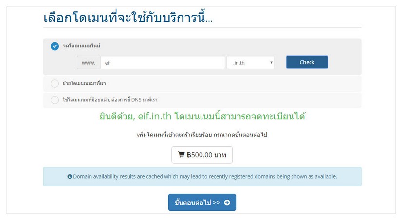- สำหรับบริการเว็บโฮสติ้ง จะต้องสมัครใช้งานพร้อมโดเมนเนม โดยที่ท่านสามารถเลือกจดโดเมนใหม่, ย้ายโดเมนมาต่ออายุกับเรา หรือใช้กับโดเมนเนมที่มีอยู่ จากนั้นคลิก “ขั้นตอนต่อไป”